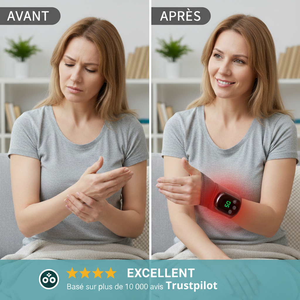 Elle aide à soulager les douleurs, tensions et raideurs du poignet grâce à la compression, la chaleur et/ou les vibrations de massage.